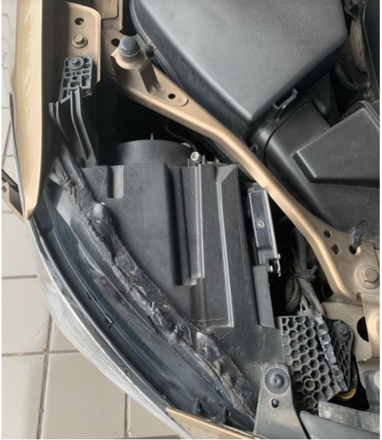 打开引擎盖发现大灯位移量还是比较大的,后面的杆子被顶变形了,不知道这个能不能单独更换,反正交给店里面处理了。