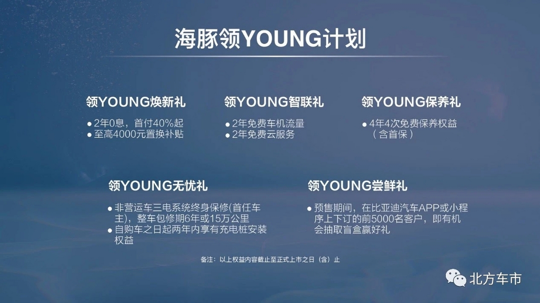 为了减轻年轻用户的购车压力,为首批海豚用户提供更多福利,比亚迪特别推出“海豚领YOUNG计划”。自预售开启之日起,截止至海豚正式上市当日(含),预订海豚的用户可享受包括“2年0息,首付40%起”“至高4,000元置换补贴”在内的多重权益大礼,通过比亚迪汽车APP或小程序下订的前5,000名客户,更有机会抽取盲盒赢好礼。