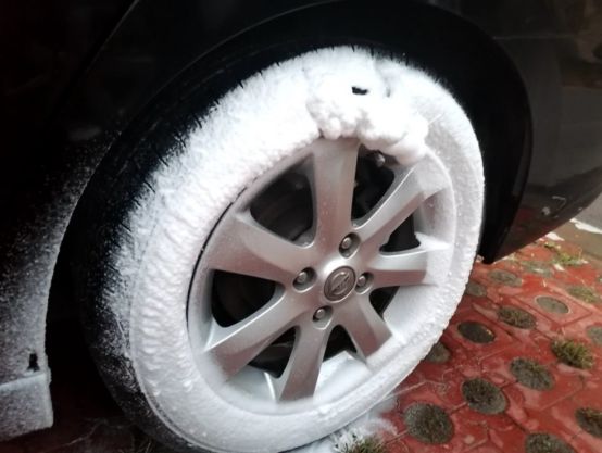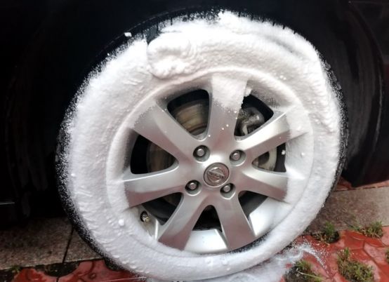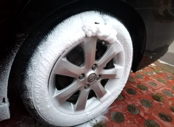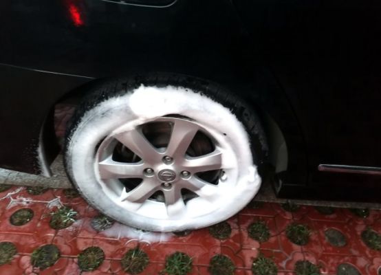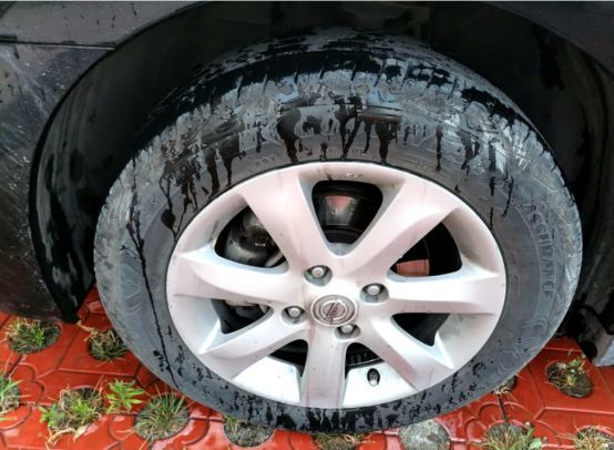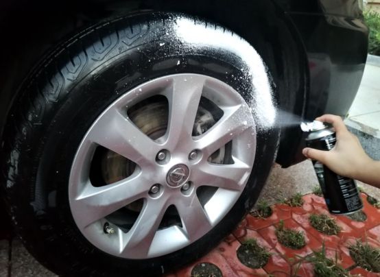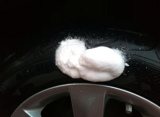 打开轮胎清理泡沫剂,拧下盖子,摇晃一下,均匀的喷在轮胎外侧的表面上,犹如盖上一层白雪。