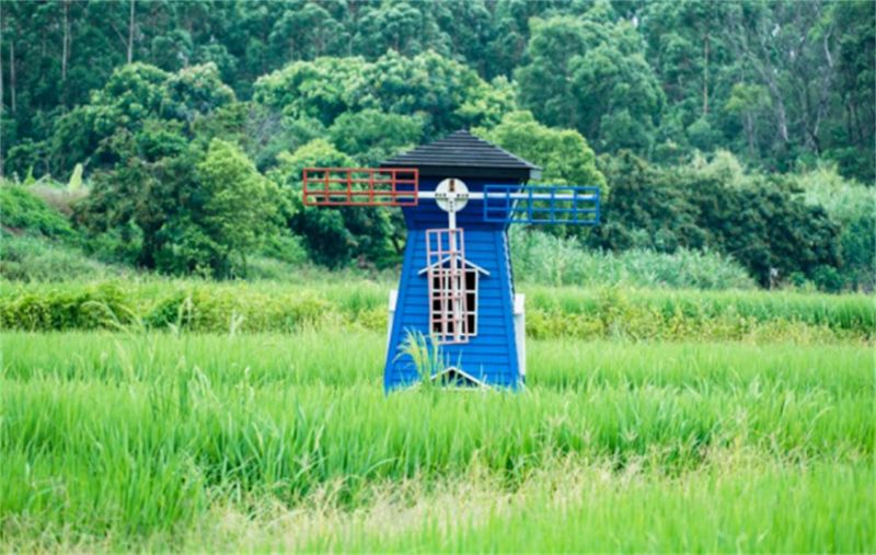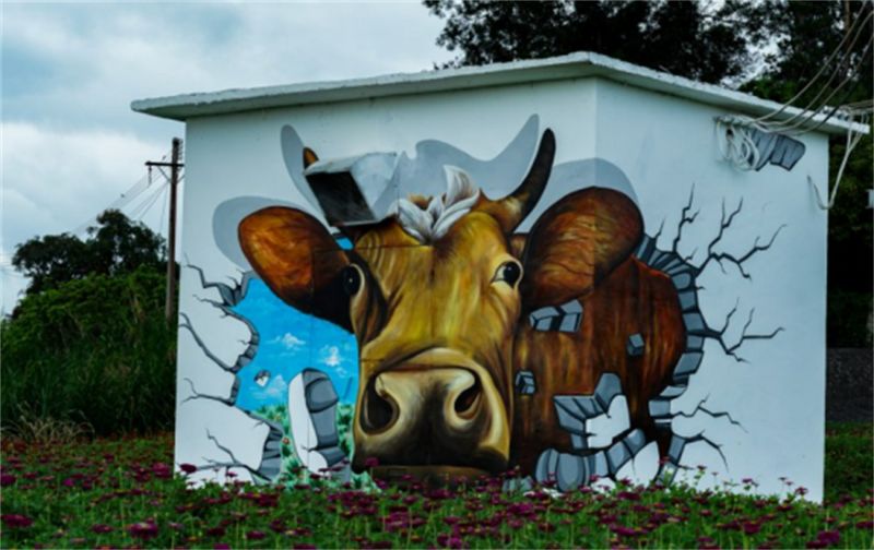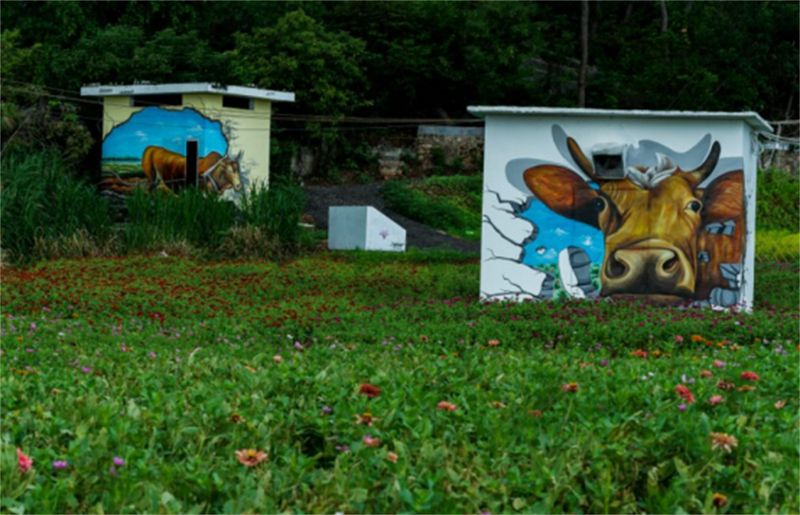 远处的配电房墙壁被涂鸦,很有田园风格的壁画。