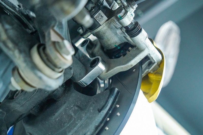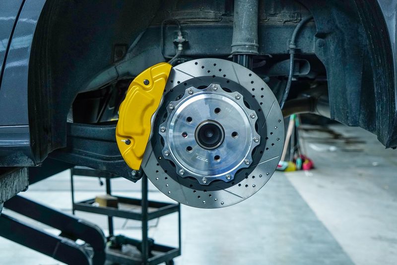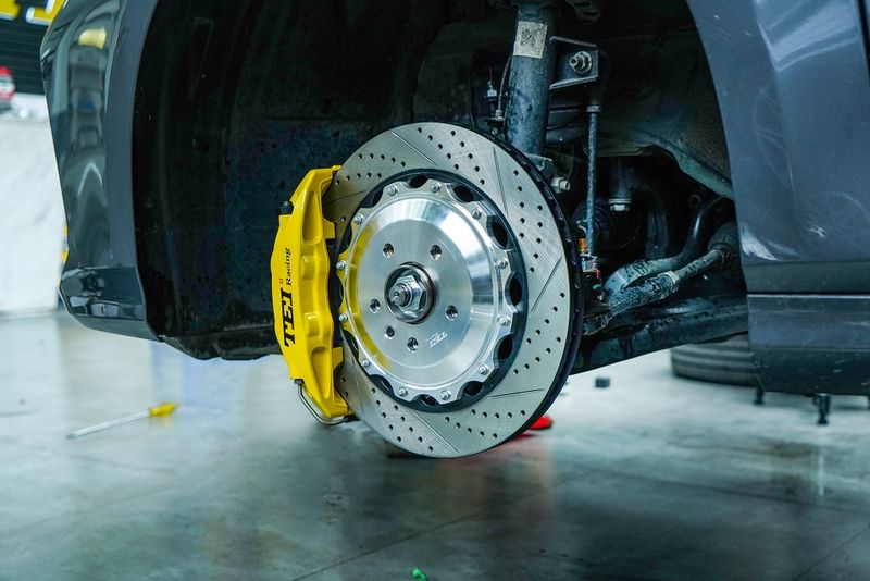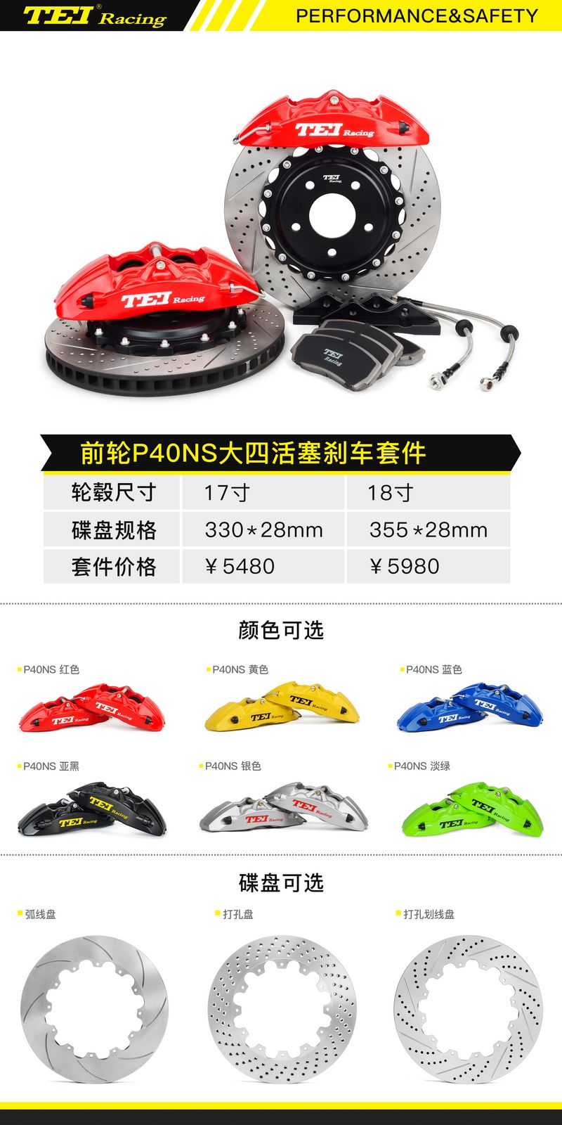 前轮刹车套装:P40NS黄色大四活塞卡钳,搭配355x28mm打孔划线纹分体盘;