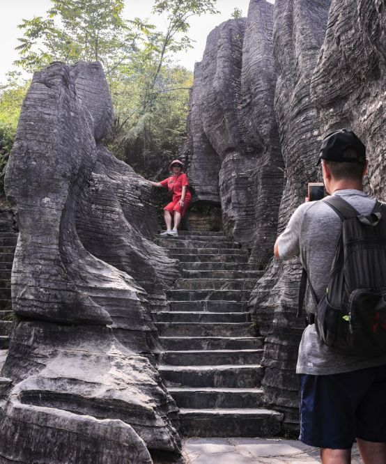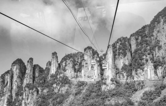 索道上看到的风景。走到山腰,跑到石林里去。这里巨石翻滚,奇峰突起,石波起伏,连绵不断,下面有许多悬崖平台,视野广阔,是个不错的观光场所。所以不时有人爬上山顶,面对山峰,或回到悬崖,留下一个标记(拍照)。