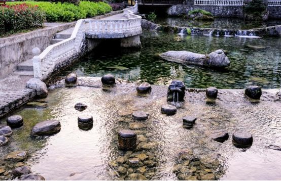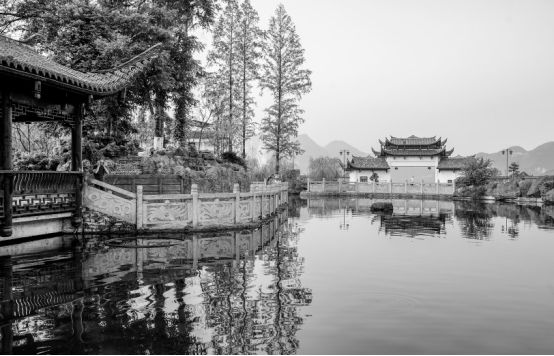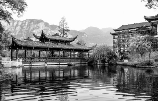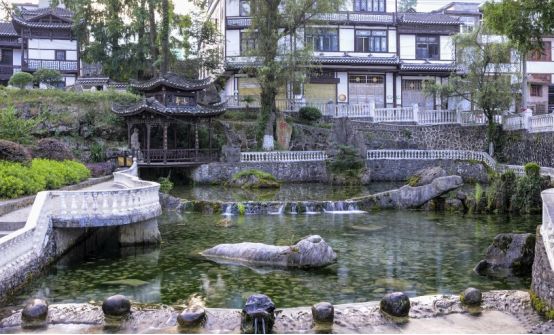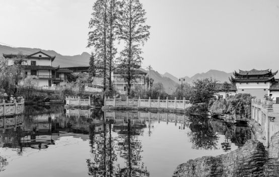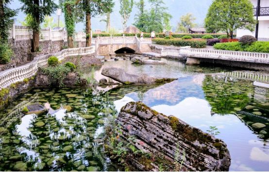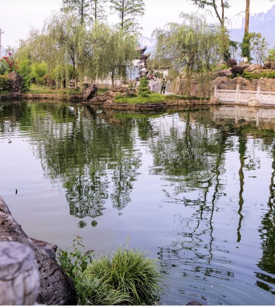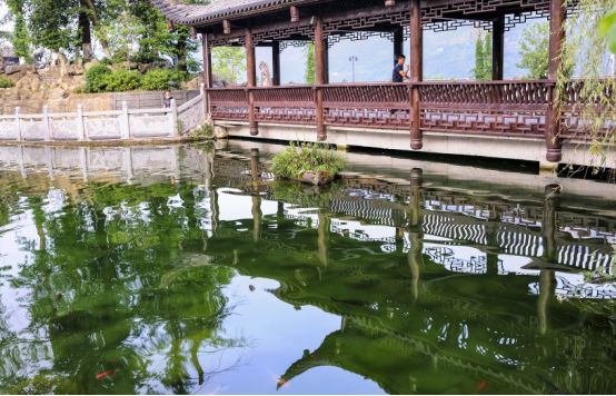 古镇一景,池塘、亭台、廊道、瀑布、悬崖风光、清江白云和山峰林石群,映在池塘里,成了景物中的一面镜子,水在天空中.. ..清晨的阳光下,美得简直难以置信!