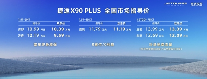 在令人心动的售价基础上,捷途汽车还带来了捷途X90 PLUS全系车型6000元的优惠及三重欢乐礼遇,即欢乐价9.59万元-13.39万元,及整车终身质保、0首付/0利息、终身免费流量(终身免费基础流量+5年免费娱乐流量),三重欢乐礼遇覆盖了购车、用车、养车全生命周期,让用户轻松开启欢乐生活。