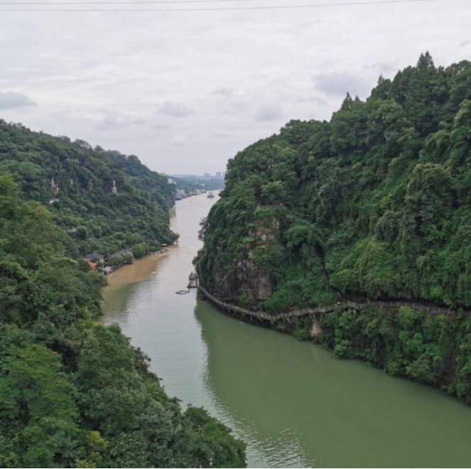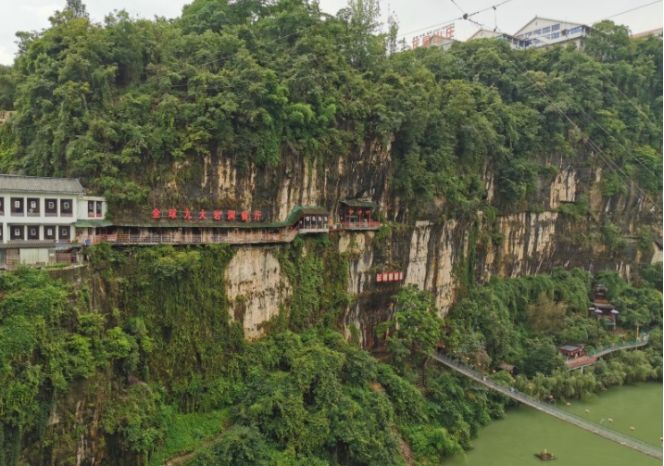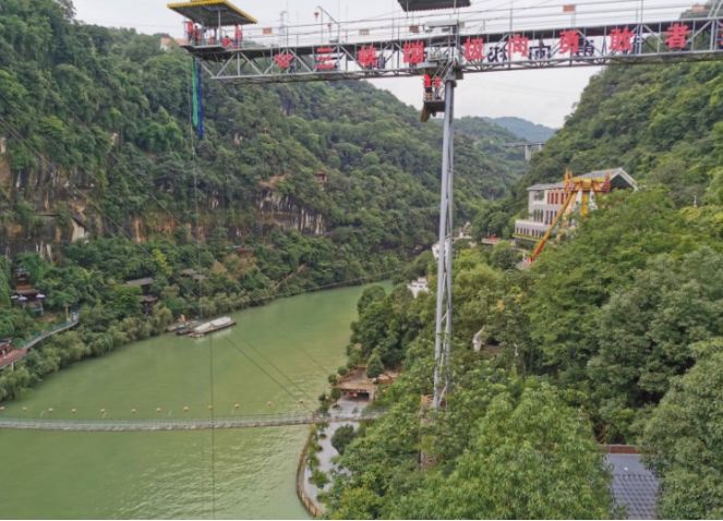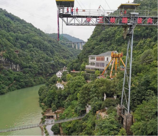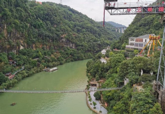 主要特色就是在岩洞内,站在栈道上视野开阔,可看三游洞的游客,江面的快艇,还有对面勇敢者的蹦极及峡谷内的秋千大转轮等。