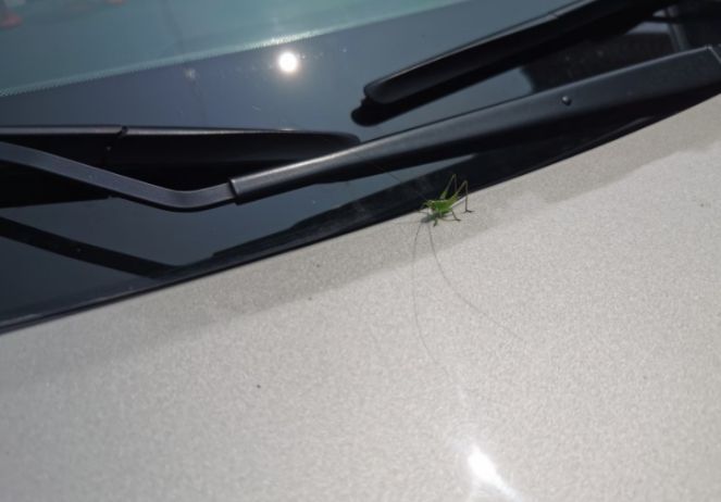 车头上不知啥时候跳上来一只蚂蚱,这须子可真长,难道在笑话我?