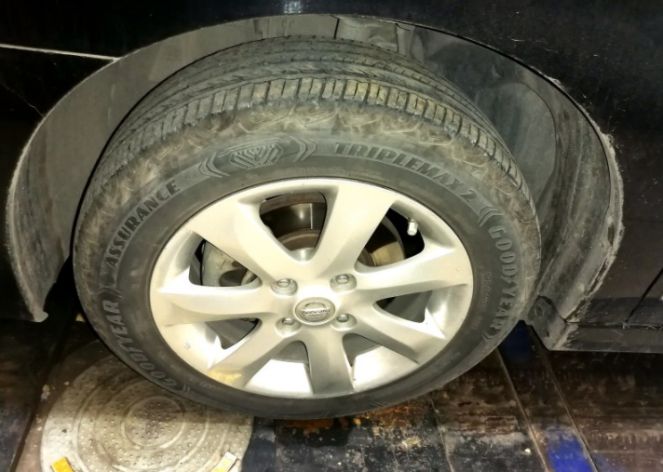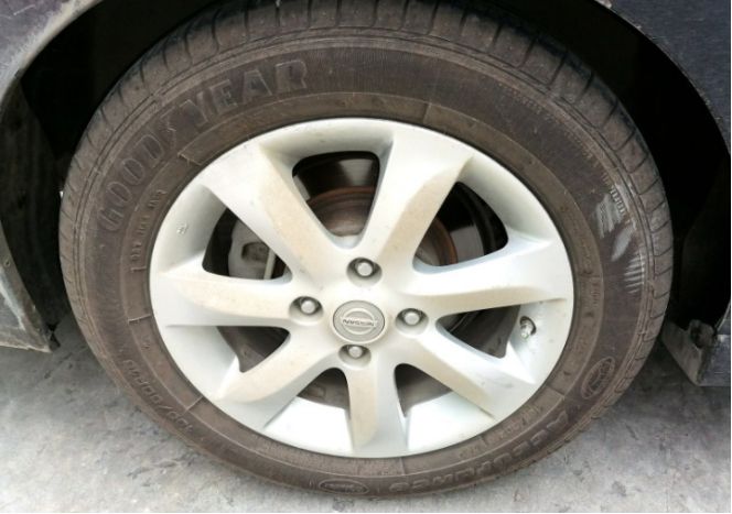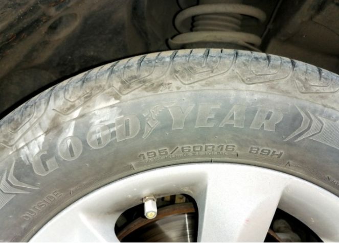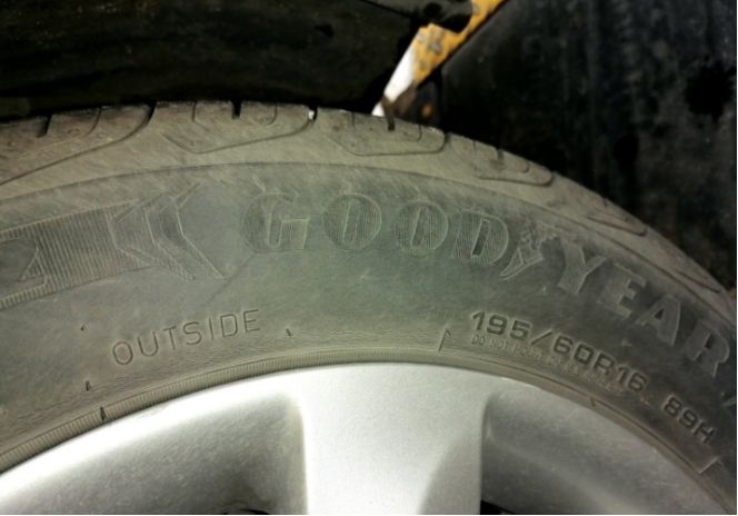 因为倒车时刮了轮胎的侧面,淘了一条老固特异轮胎,虽然花纹不一致,先将就着用吧。过一段时间考虑一起换吧