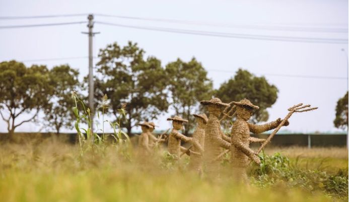 前天不经意间在朋友圈看到了金色的稻田边一个个惟妙惟肖的稻草扎制的人物、动物,顿时来了兴致。我也是农村走出来的娃,对这一切最是亲切不过了。儿时没有什么玩具,农忙时节地里的泥土快,稻草便成了我们取之不尽的"玩具”,因此时隔几十年再看到这些,而且是比儿时更为有趣的东西,自然勾起了我的一份美好回忆,以及有种想身临其境一探究竟的小激动。