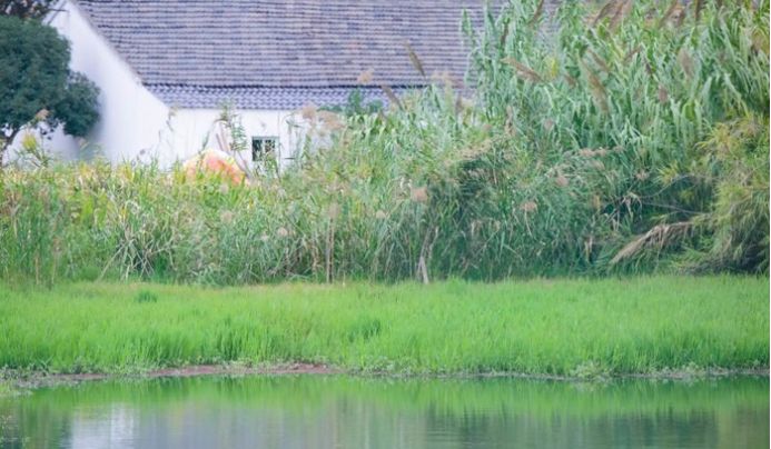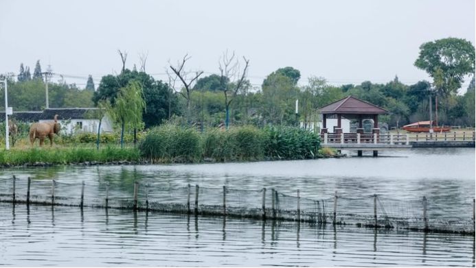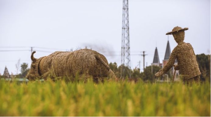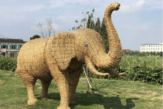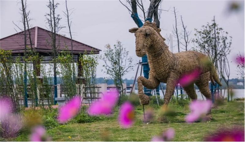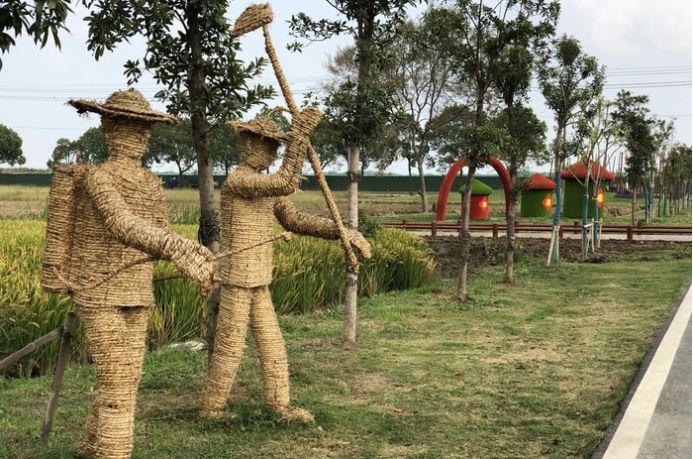 继续沿着青荡走,一路上还有各种各样的稻草工艺品。有憨态可掬的大象,花田中还有牧童骑黄牛。让人饶有兴趣,愿意继续这样走下去。