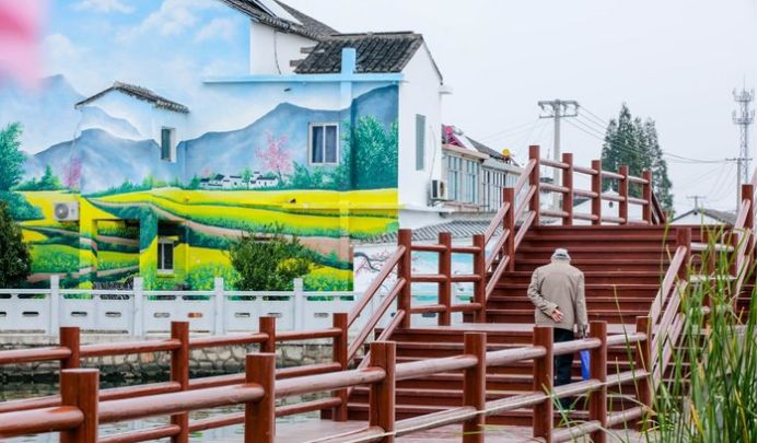 走过这座桥就可以来到先前看到的那些更为高大上的景致处了。旁边的村庄房子墙壁上也都画上了颇有乡村意味的画,美丽的新农村我喜欢。有爱美的美女在拍照,也有幸福的老人在散步,这样的和谐画面是我最喜欢看到的。