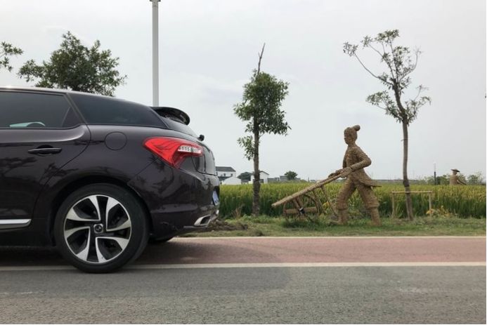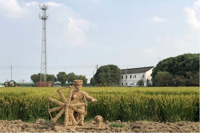 秋高气爽的一个午后,我驱车来到了这个城市人新的打卡地,地处无锡最东面的一个普通的小乡村——青荡村。这里因有一片湖水因有一定的深度,水的颜色比较暗,但非常清楚而得名。还没驶进村道,就看到入口处颇具味道的布景,新农村建设如今也走上了园林设计的轨道,高大上的感觉扑面而来。刚驶进村道,就看到了稻田两边有着各种各样的稻草工艺品。