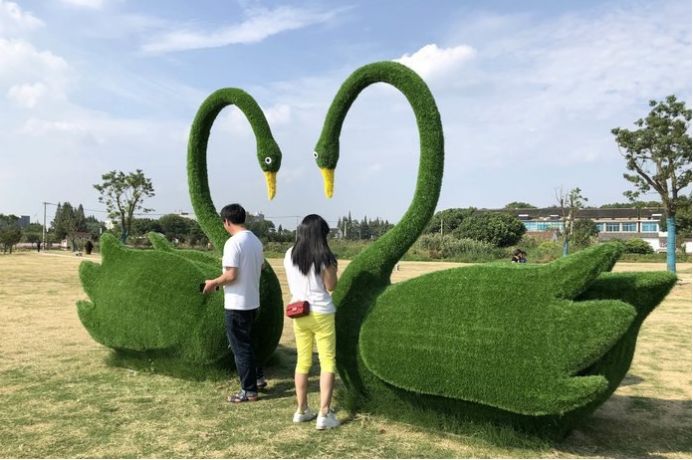 这块草地上还有很多稻草扎制的工艺品,这两只天鹅是很多情侣的打卡地。
