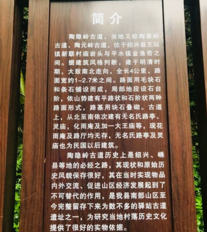 陶宴岭又名陶隐岭,始建于南朝,完工于明清,古道大致呈南北走向,北起平水镇的金渔岙,南止王坛镇的新联村,是旧时绍兴、嵊州的互通之路,其现状和原始历史风貌保存完好,是南部山区至今仍保留完好的驿站古道之一。古道因南朝齐梁年间道教思想家、医学家陶弘景隐居于此而得名。