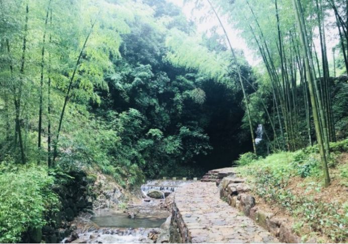 今天的陶宴岭古道,一路都是绿阴相随,溪水潺潺,一会在竹林中穿越,一会叙到了枫杨树下,绿茵、小溪、古道相映成趣,俨然一幅山水画卷。从村口古道入口处的宣传栏中可以看到,秋天的古道,景色最佳,那是枫杨树红火一片,