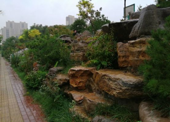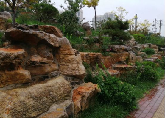 路边的石头假山造型,给马路路边增添了不少乐趣。