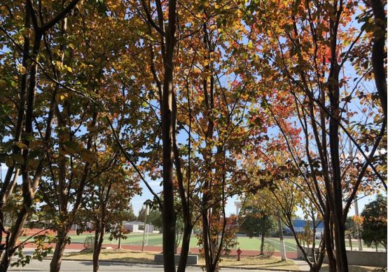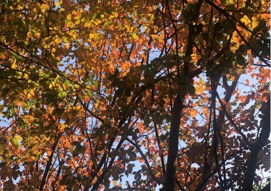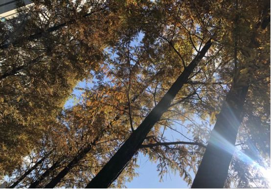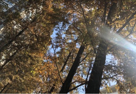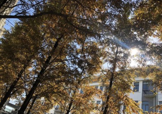 这棵树尤为明显,中午的阳光下, 透着秋天的斑斓色彩。