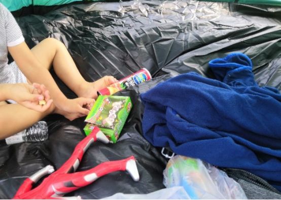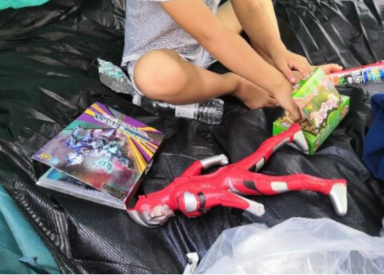 我家宝宝,网上买的露营帐篷,如今用上了。三下两下就能搞定,然后,我们开始分发食物,玩具。