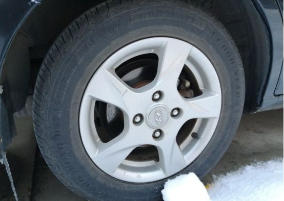 车轮上倒没有多少冰雪,可能是因为没在路上跑的原因,这是老伊前年新换的固特异安乘轮胎。