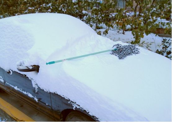 雪停了抓紧时间清理,否则夜里温度一下降再次结冰就更难清理了。拿出拖布来清理一下车身的大量积雪。