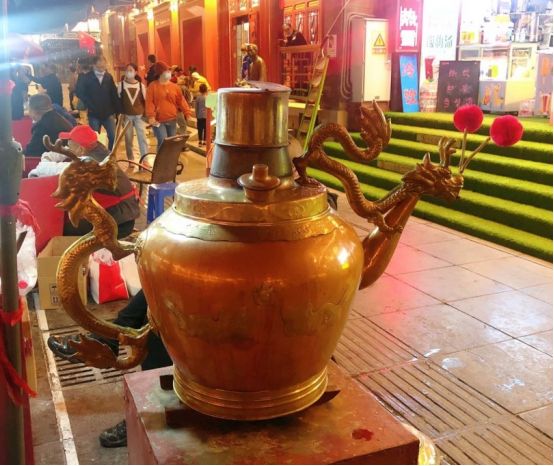 首先是我最爱的特色小吃龙嘴大茶壶,顾名思义它的特色就是有个铜制的龙嘴大茶壶,我个人比较喜欢的面有糜子面、林米面和杏仁面,将面放在碗中,用滚开点的水冲熟,撒上葡萄干、青丝玫瑰、糖一起搅拌均匀,非常好吃,建议大家可以尝尝。