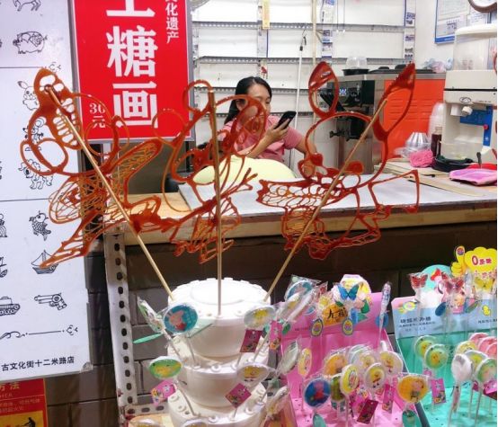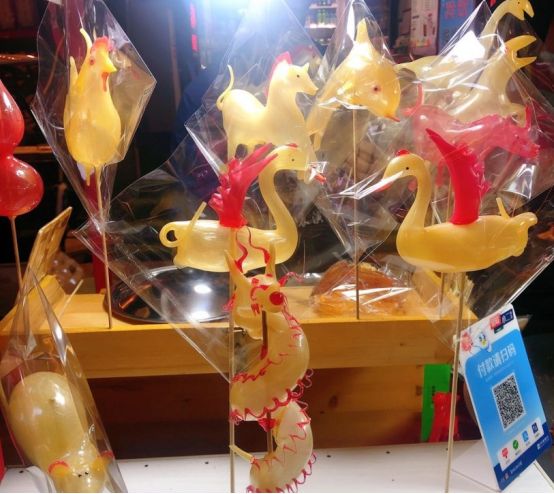 吹糖人也属于非遗文化小时候有手艺人走街串巷叫卖,我们都会买,玩完了再吃,长大后才知道人家吹完有细菌,真不知道我们这代人是怎么活下来的。这个虽然相比捏泥人储存期短,颜色也不是那么艳丽,但是它真的很有特色,而且现在还有现场制作的。