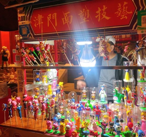 捏糖人也是天津非遗文化的一种,以前总有这样的手艺人骑车叫卖,穿过平房的大街小巷,现在基本上看不到现场捏的了,都是现成的了。