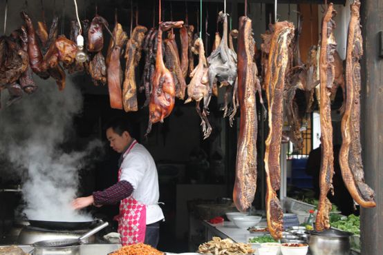 涞滩的特色食品很多,老腊肉、渠江鲜鱼、腊提花汤、滑肉片、坛子肉、土鸡土鸭、水磨豆花、米酒、琵琶酒等等等等,就不一一介绍了。我喜欢餐馆灶边上挂的老腊肉,腊肥肠,这个带一块回去很不错,有浓浓的乡土风情。