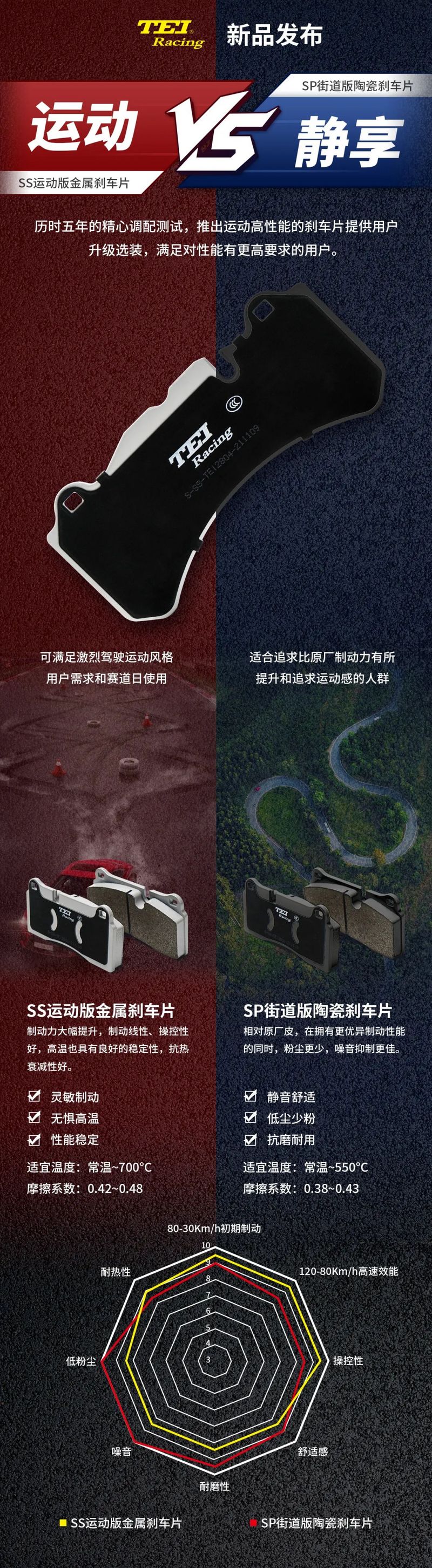 我们TEI根据车友的驾驶习惯需求,针对性地推出了两个系列不同材质的刹车片提供选择。