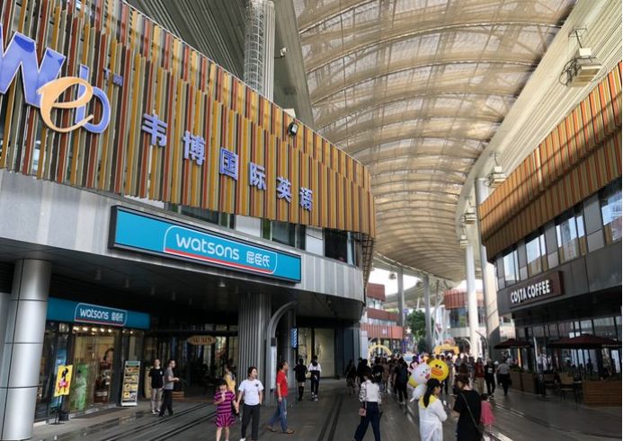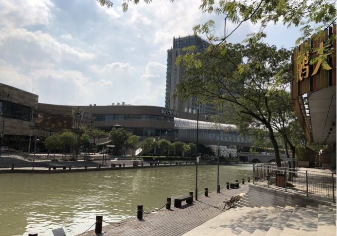 沿着河边走,穿过马路就能回到圆润广场了。