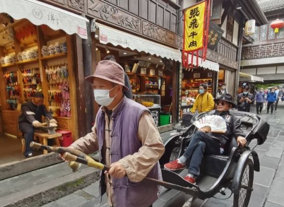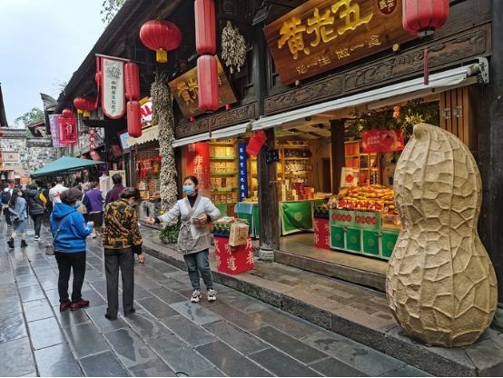 锦里前面那段街道是制作牛肉干、花生、辣椒酱和银器等土特产及工艺品的门店。
