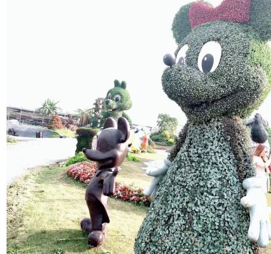 国林里有很多这样的造型设计,硕大的脸谱看起来很逼真,我旁边的小朋友都吓了一跳。功夫熊猫的雕塑吸引了我家小朋友的注意,非要上去抱抱她,这里不仅是大人的乐园,同时也是小朋友们的天堂。旁边的米老鼠被修建的栩栩如生,眼睛、躲这些细节的地坊也没有敷衍 经过精心装扮为园林增加了灵气。