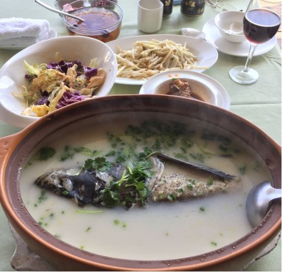 天目湖这边的鱼头汤是个特色,味道确实好,两个人吃不下,服务员表示能帮我们存起来,晚上回来帮我们热一下。