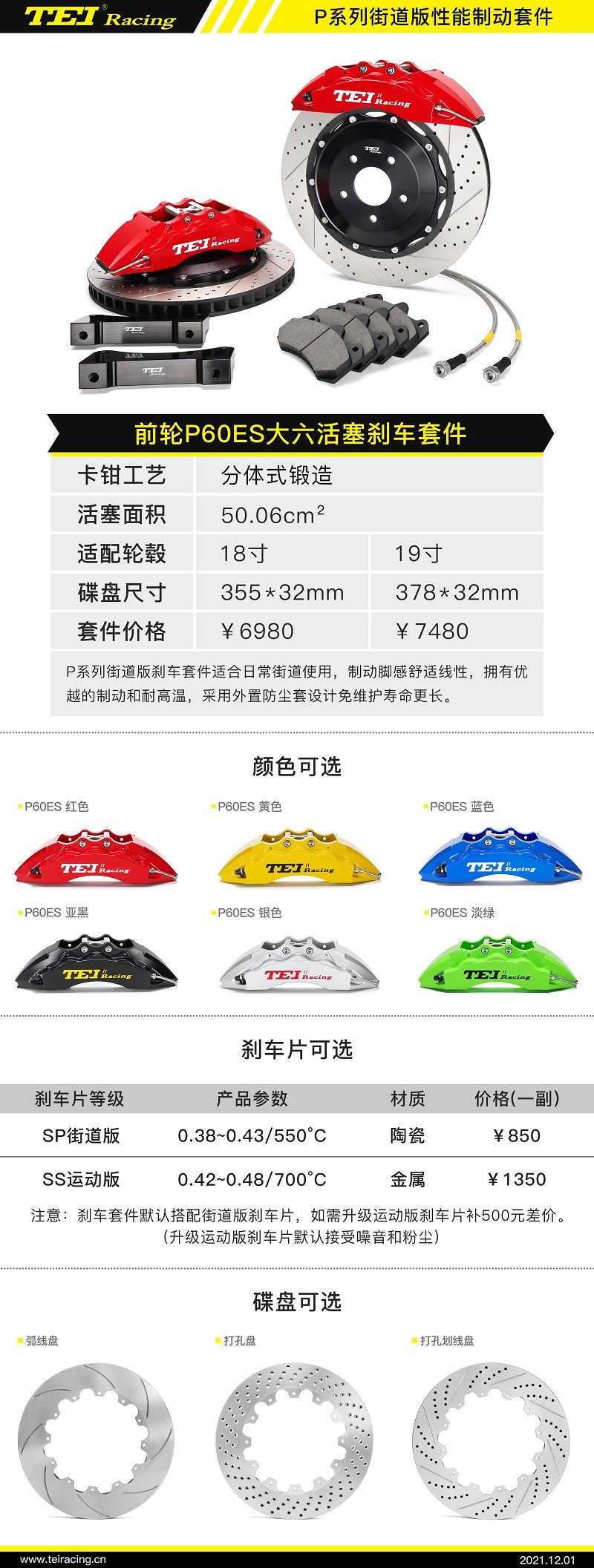 这款第四代TEI Racing P系列(P60ES)在设计上以流畅的线条,酷炫的造型在制动领域眼前一亮,颜值在线,色彩缤纷,百看不厌!刹车片方面采用高端陶瓷材质不仅降低制动产生的噪音几率,而且刹车性能与上一代(P60S)相比做了10%的提升,有效缩短制动距离!这款卡钳适用于18寸以及上轮毂才能安装,并且搭配了更大直径的刹车盘355*32mm和378*32mm。