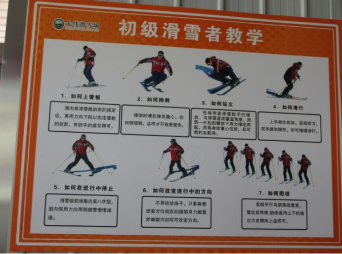 我这次自驾游,是和我女朋友去大青山太伟滑雪场。这是标识牌,教怎么滑雪的,当然我这种熟手是不需要仔细看的。