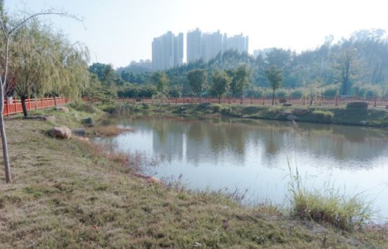 公园里有一处小水池 ,微风吹来,泛起点点波光。
