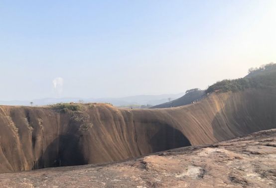 本来觉得坡度大会很滑上不去,后来在一位热情师傅的带领下,慢慢走了上去……上去之后视野很开阔,惊叹大自然留下的礼物,这是火山口喷发形成的丹霞地貌。