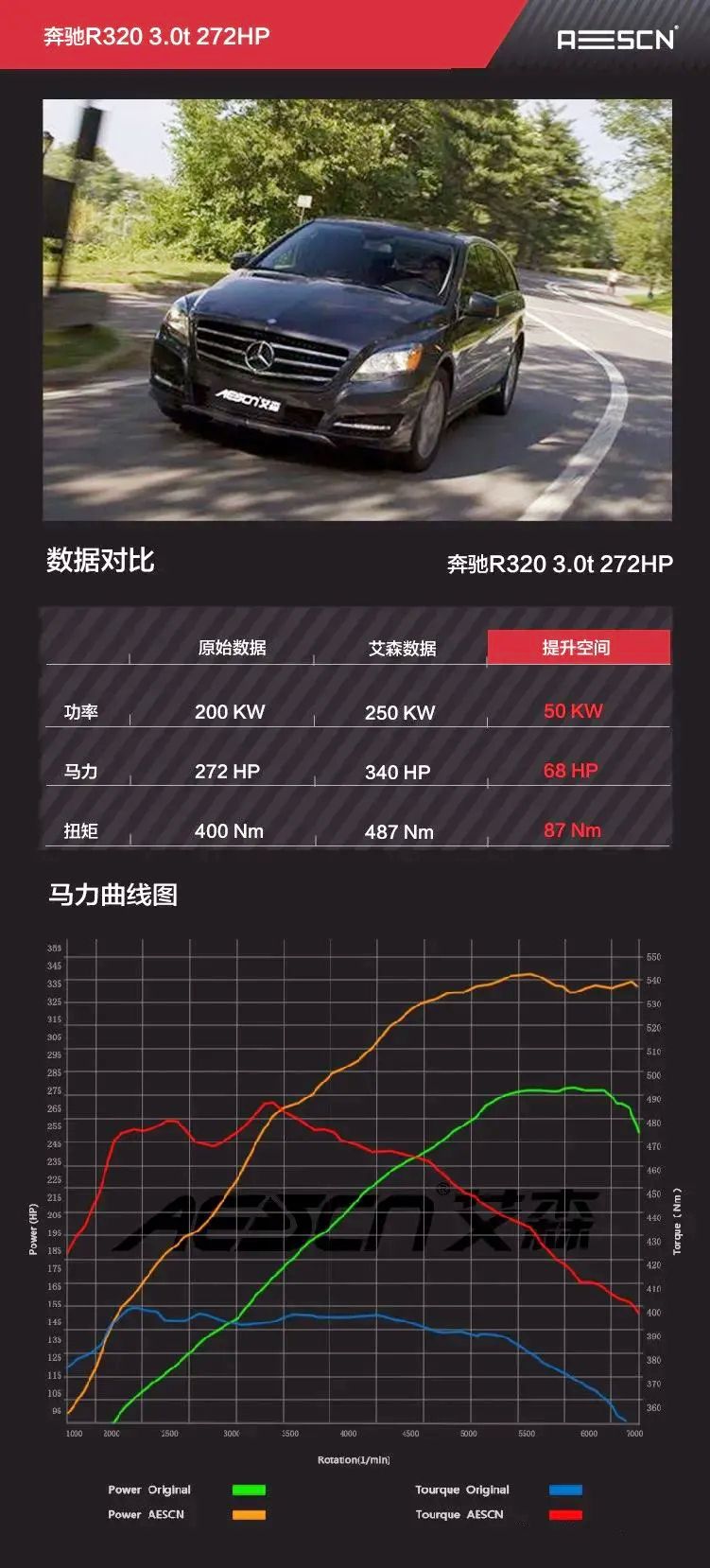 艾森发布奔驰R320 3.0T程序方案:一切以安全、稳定为前提,在不损伤发动机寿命前提下,将动力优化至最佳,同时符合车主的驾驶需求,性能参数如下: