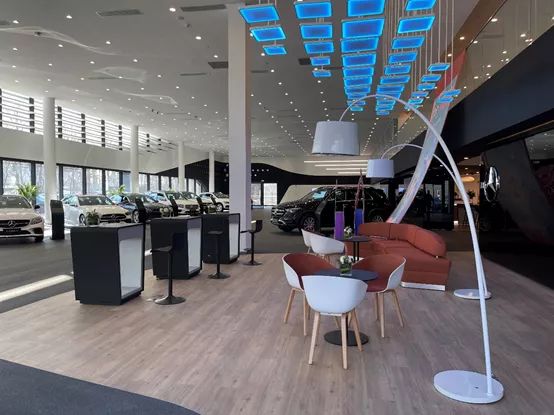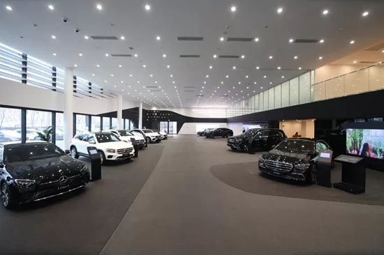 新展厅展示面积近1000平米,可以同时容纳15台以上的展车,在空间布局上采用分层次设计,将现代与未来同时展现,充分体现了梅赛德斯-奔驰的豪华与尊贵。