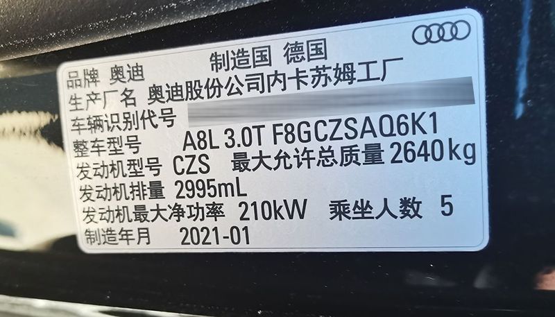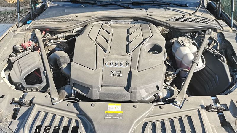 这台21年1月出厂的奥迪A8L 50TFSI搭载着3.0T V6低功款发动机,同时配备48V轻混系统。原车最大马力286匹(210千瓦)/4500-6400rpm,最大扭矩450牛米/1340-4430rpm,与之匹配的依旧是8速手自一体变速箱。