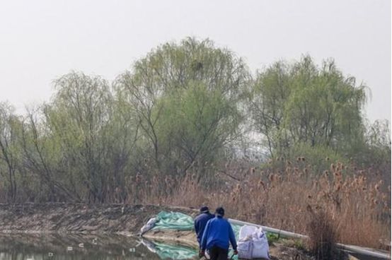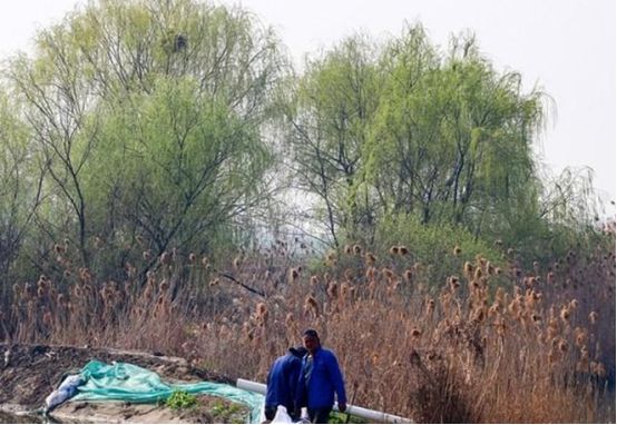 一边还有正在加固河堤的工人。