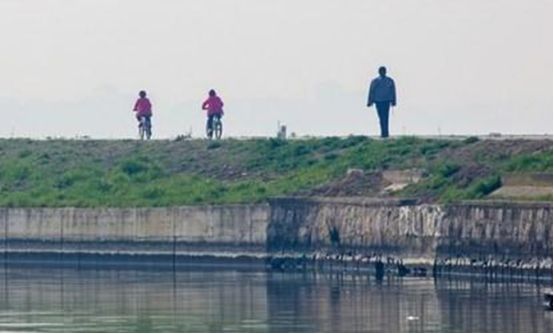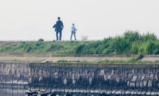 堤岸上早已有来此散步放松的人。