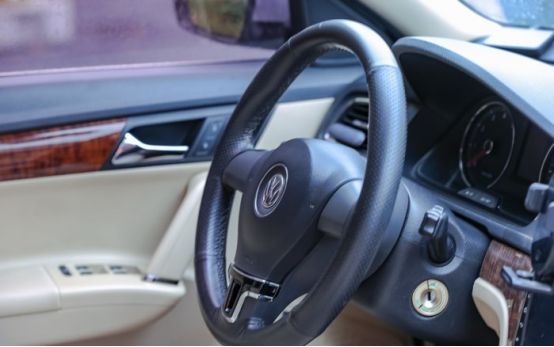 原车塑料方向盘,自己缝了个真皮方向盘套,用了七年多了,手感越来越好了。