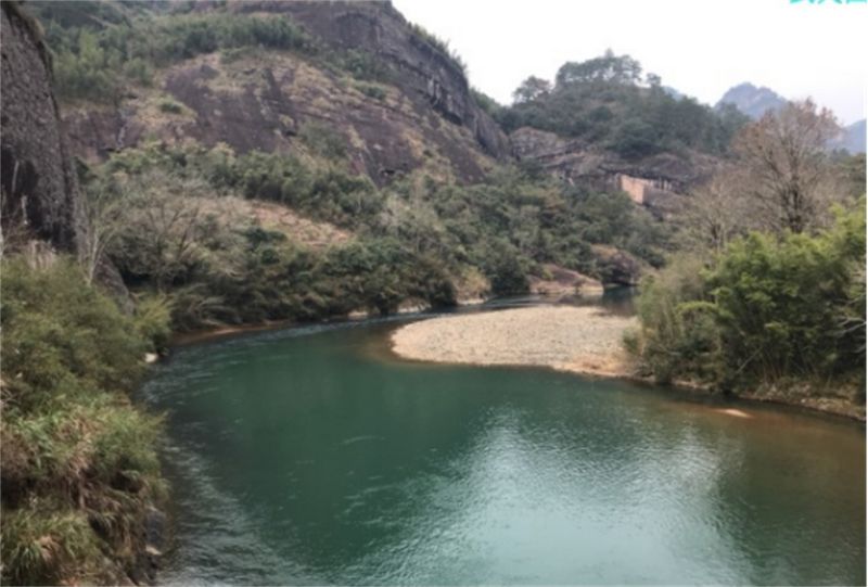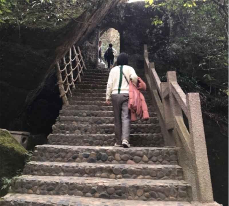 天游峰虽然不高,但很险峻,台阶直通峰顶,但很是狭窄,有的只能错身而过。我们一口气爬到半山腰,回身俯望,远山近水尽收眼底,九曲溪在山间弯弯曲曲形成美丽的曲线,时不时飘过的云雾落在半山间,如同经纱围绕在青山绿水之间,如同展开了一幅美丽的山水画卷。