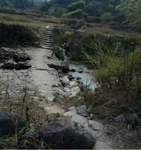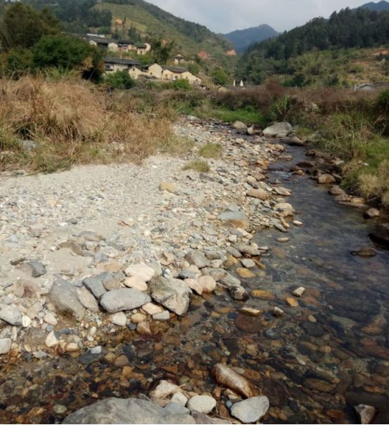 小溪水潺潺。这边的水还是很清澈的,还有些小鱼苗在游。