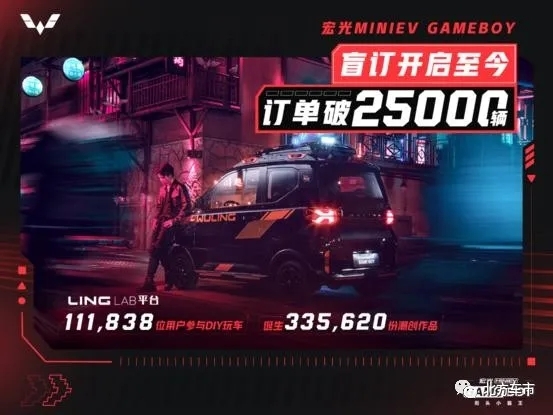 【2022年4月1日】今日,上汽通用五菱宣布,“街头小霸王”宏光MINIEV GAMEBOY将于4月8日潮酷上市,带领用户畅玩潮创游戏新世界。自盲订开启以来,新车掀起抢订狂潮,23天的时间,订单已突破25000辆。同期上线的“国内首个原厂个性化定制服务平台”LING LAB也累计收获111,838位用户的青睐,平台上共诞生335,620份优秀潮创作品。