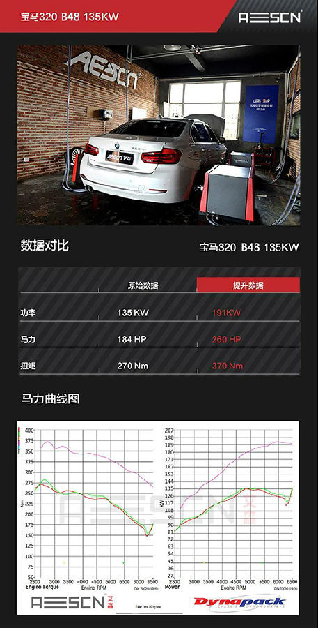 艾森发布宝马320i B48程序方案:一切以安全、稳定为前提,在不损伤发动机寿命前提下,将动力优化至最佳,同时符合车主的驾驶需求,性能参数如下: