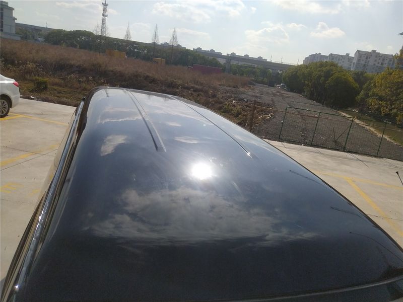 来欣赏一下车顶的风景吧,黑色车漆还是蛮亮的,映称出了蓝天白云,你别说看起来还挺美的哈。