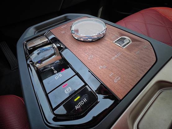 再来说说我个人的最爱——这块质感极为美妙的控制面板。上面有木材、钢琴漆材质、水晶质感材料……而且这块水晶材质旋钮所承载的,正式宝马家族里的第一个iDrive 8.0系统。