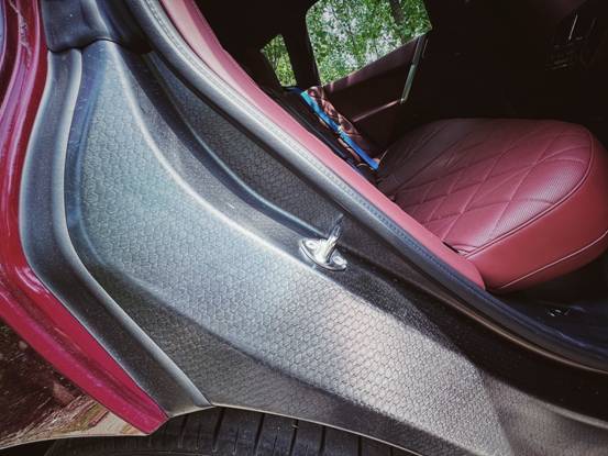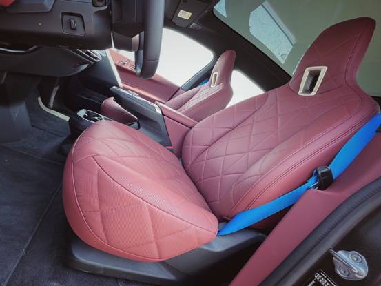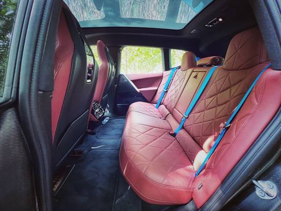 后排座椅的材质和设计与前排非常相似,座椅倾斜的角度也很合适,靠在上面很贴合,蓝色的安全带也挺别致,每次扣上都有满满的仪式感。
