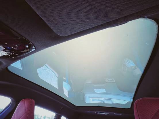 硕大的天幕贯穿前后,不仅能提供空间上的开阔感,还能一键完成变色,瞬间提供遮阳功能,这张图片正是在午后的烈日下拍摄的,效果还是很不错的。